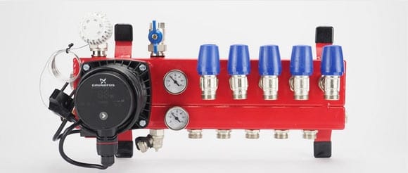 Dacă încălzirea prin pardoseală este conectată la un sistem de încălzire centrală cu o temperatură ridicată de alimentare, se folosesc colectoare de amestec cu o pompă de circulație .